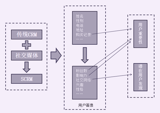 社交媒体不仅是内容共享和通信的平台,还是企业获取用户数据的重要来源。传统的CRM形成用户画像的数据来源主要是用户在交易或电话交流等过程中,自主提供的数据,而SCRM系统使用社交媒体的公开数据作为有价值的数据源,以补充用户资料中缺失的信息。它引入了“社交用户资料”,该资料一方面可以与传统用户资料数据集成在一起,一方面又可以从社交网站捕获更多的信息。