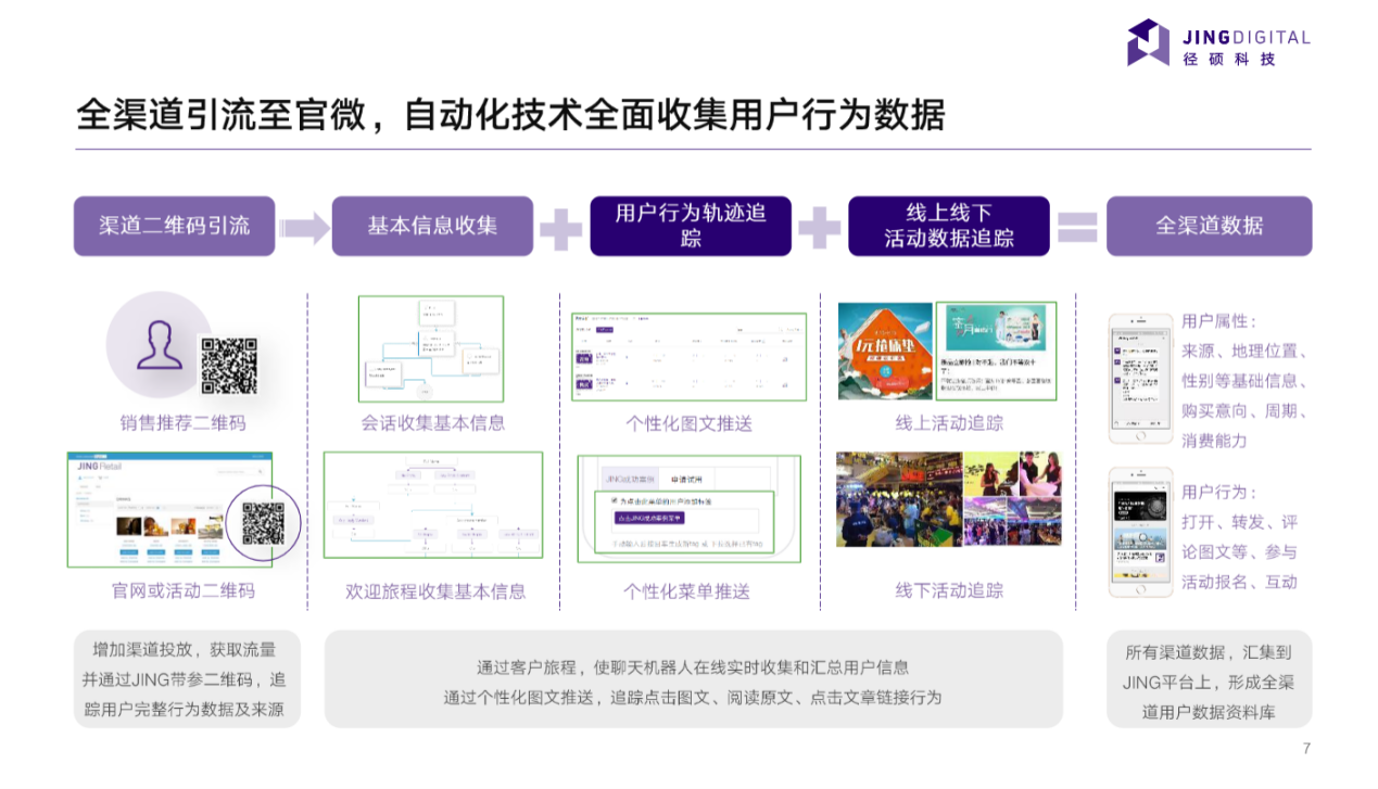互联网用户可能成为企业的客户,同时也是最令人信服的宣传员,多从用户需求的角度去设计微信内容,以各种形式的内容作为载体去建立与人们之间的沟通,分析信息和传递价值,通过JINGdigital微信营销软件自动化触达用户,拉近企业与用户之间的距离,起到维护老用户并开发新客户的作用。做好内容和产品的同时保持与客户的日常互动与交流,再结合营销工具根据用户行为标签和打分,进行后续的销售与转化。