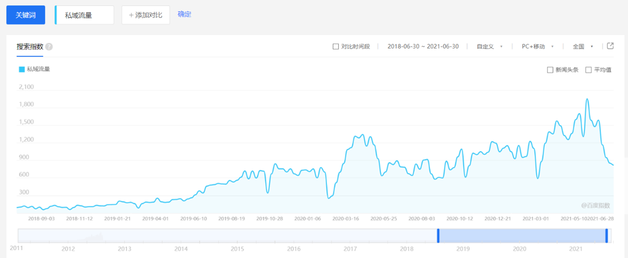 图一、2019年6月至2021年6月,“私域流量”的百度指数增长