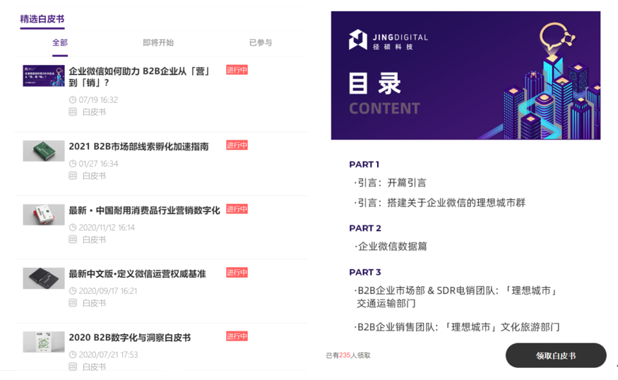 内容营销中台:镶嵌在公众号菜单栏的内容营销中心,通过干货满满的内容吸引粉丝留资,有效获客,降低企业运营成本。