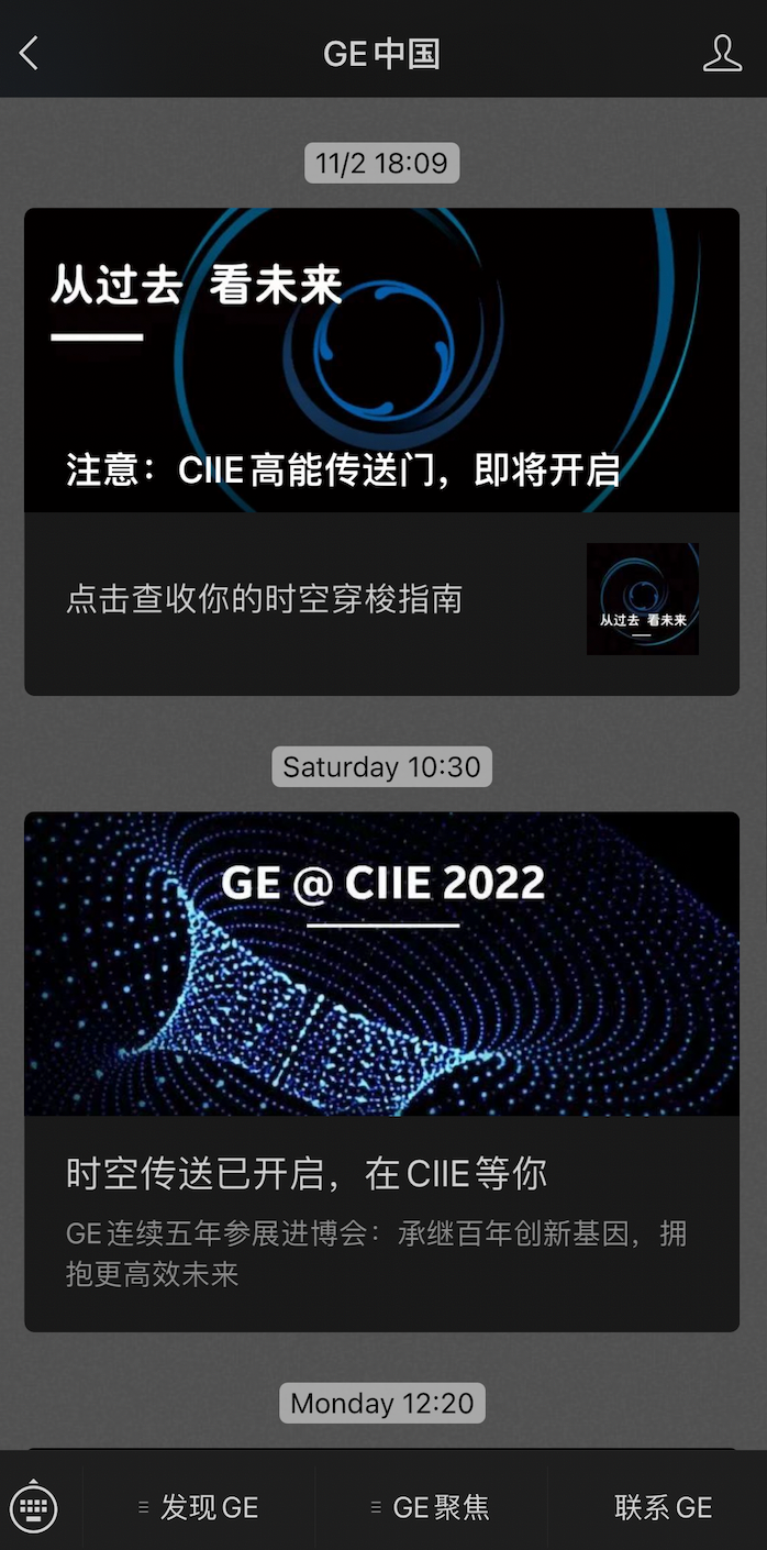 「GE中国」时空传送门主题与进博会结合,通过不同目的地的领航员领航,实现未来探索,与视频号连通,跨平台文字+视频输出。