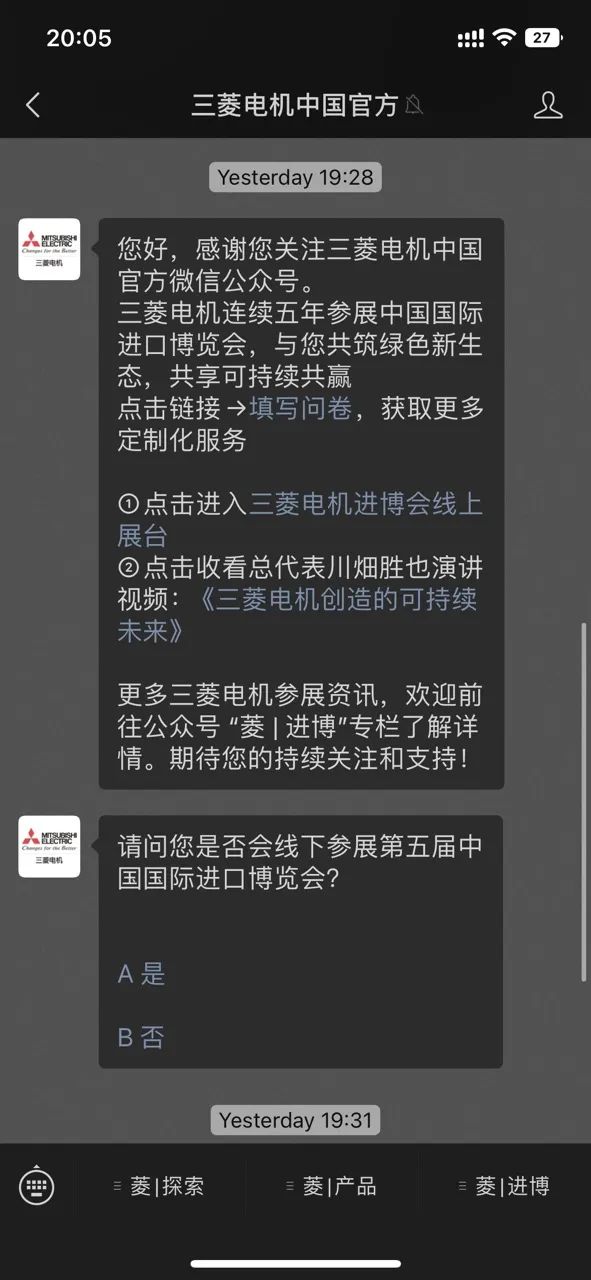 通过在报名观展海报中植入「个性化二维码」,「三菱电机」实现了对进博会相关用户的精准识别。公众号欢迎语直接导出线上展台、视频、问卷相关信息,与用户的个性化互动感拉满,公众号菜单嵌入云展厅和展品手册,进博会期间利用菜单捕捉精准用户。