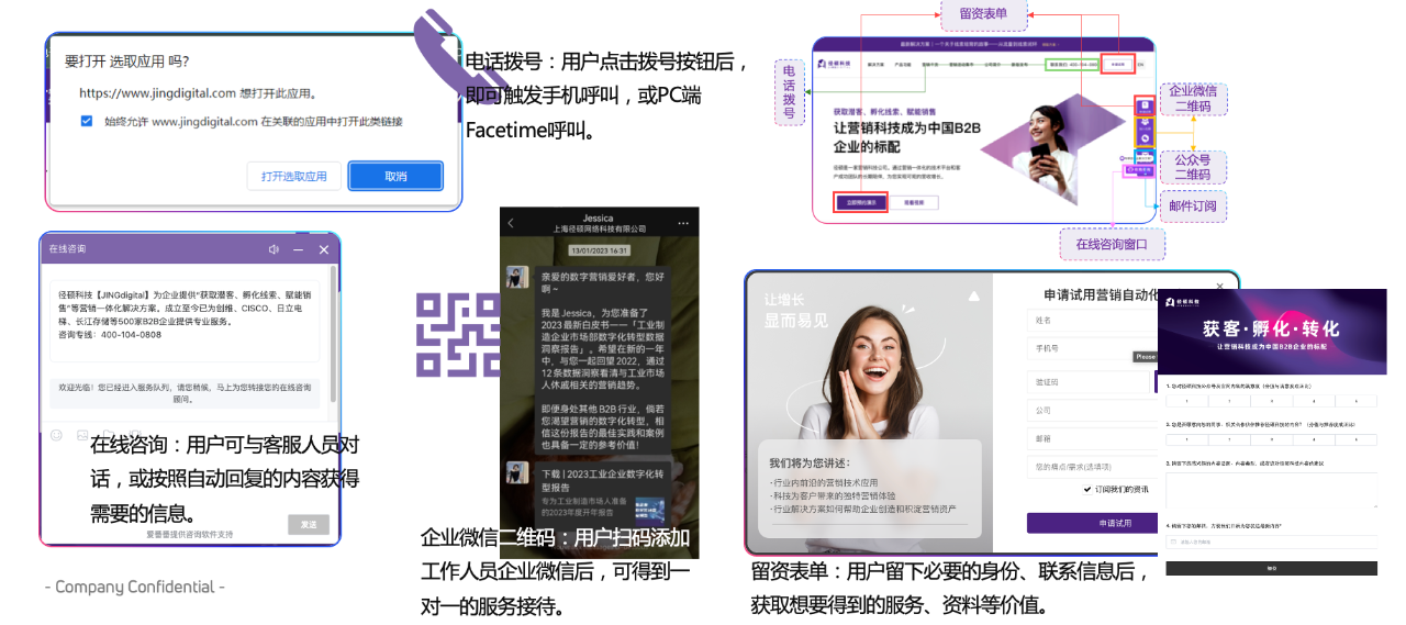 企业整个投放和培育策略,其最终目的是将流量吸引转化为可联系的实际人。因此,在官网、投放页多样化布局CTA,可以达到降低用户留资门槛,提高流量实体化概率的作用。