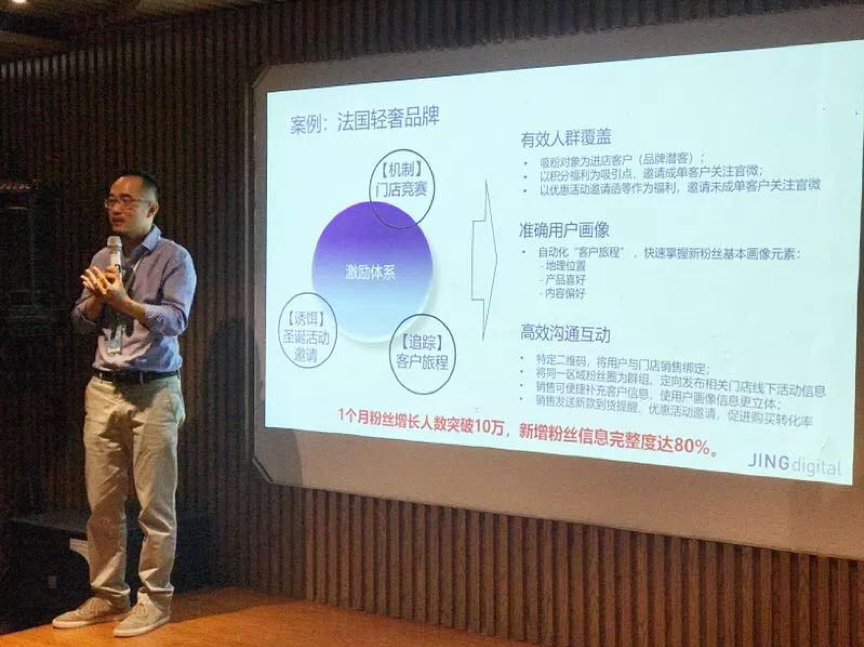 洪锴先生分别从JINGdigital服务过的4个行业品牌真实案例出发,生动解析上述4个挑战的实战操作:从关注初始,JINGdigital就可借助营销自动化技术帮助品牌增加与用户间的黏性,利用客户欢迎旅程给用户留下深刻印象,增强互动,极大降低新用户取关率的同时,对客户画像有了更清晰的了解,如:产品喜好、内容偏好、地理位置、等。针对现有微信用户,JINGdigital的深度分析界面、聊天机器人、个性化菜单、O2O销售工具等多种功能,配合JINGdigital各场景的营销策略,让品牌微信的KPI增长节节攀升、运营如虎添翼。