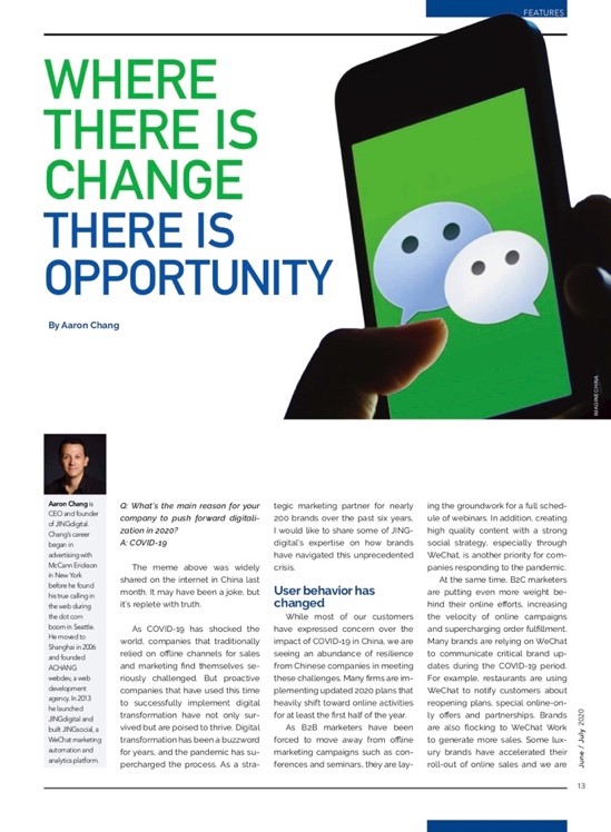 As COVID-19 has shocked the world, companies that traditionally relied on offline channels for sales and marketing find themselves seriously challenged. But proactive companies that have used this time to successfully implement digital transformation have not only survived but are poised to thrive. Digital transformation has been a buzzword for years, and the pandemic has supercharged the process. As a strategic marketing partner for nearly 200 brands over the past six years, I would like to share some of JINGdigital’s expertise on how brands have navigated this unprecedented crisis.